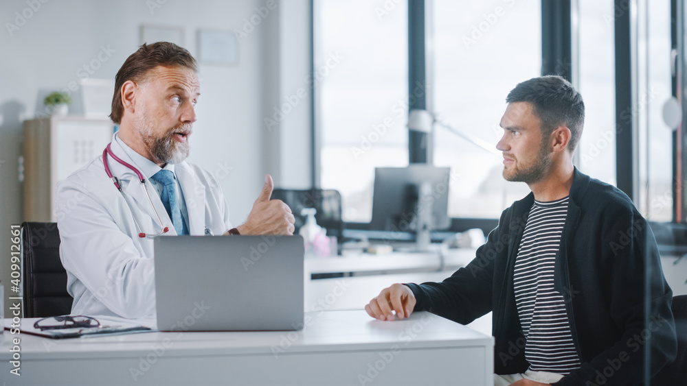 Family Doctor Is Delivering Great News About Male Patient S Medical Results During Consultation In A Health Clinic Physician In White Lab Coat Sitting Behind A Computer In Hospital Office Stock Photo